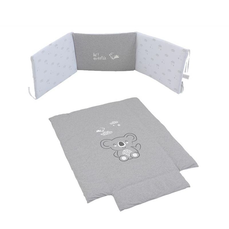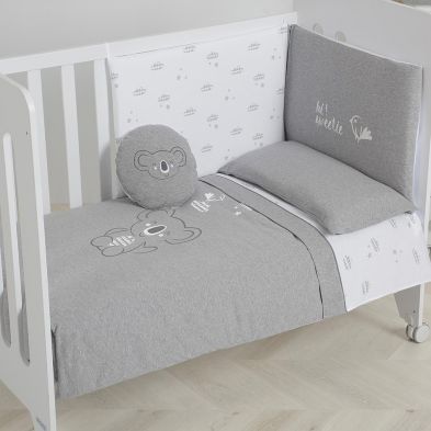 Además del nórdico + protector, la colección de textil Koala dispone de juego de sábanas, funda vestidor bañera y un simpático cojín, todo a juego con la cuna y la bañera de la misma colección.