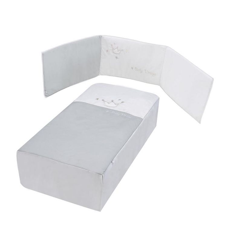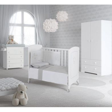 Este es el edredón y protector de una colección muy especial y elegante, bordada con delicado hilo de plata y elementos en materiales suaves, dulces y acolchados. En tonos grises y blancos, combinará a la perfección con todas nuestras cunas de 120×60 cm.