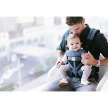 - Su cinturón con apoyo lumbar se puede ajustar arriba o abajo, lo que permite un perfecto ajuste en la cintura y mantener al bebé lo suficientemente cerca, incluso para poder besarle.
