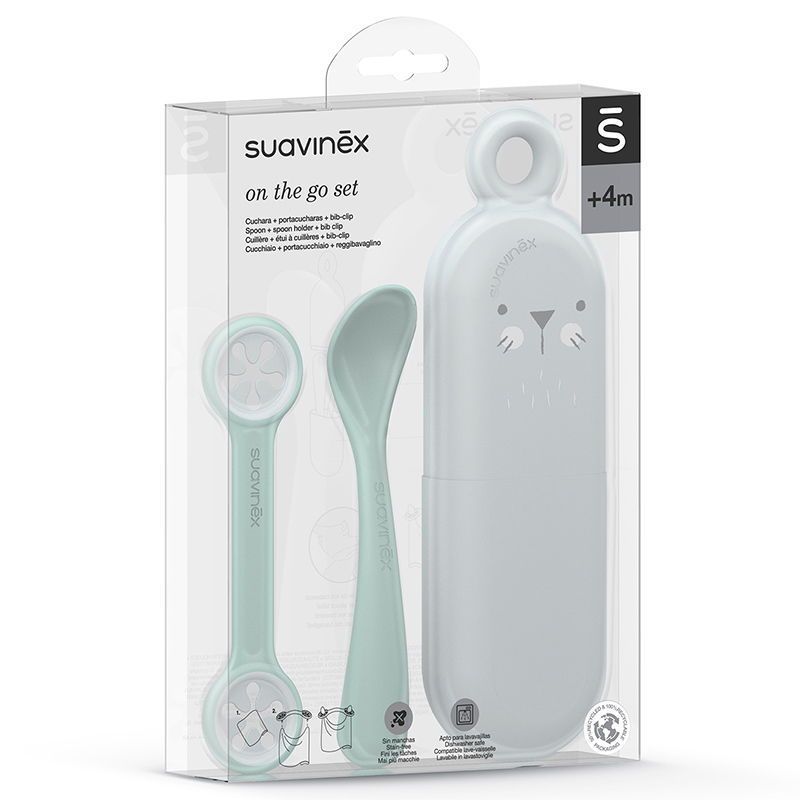 Set Cuchara Bebé + Sujeta-baberos + Portacucharas Suavinex. ¡Ideal para llevar en el bolso y dar de comer al bebé en cualquier lugar! Pensado para bebés de +4 meses.