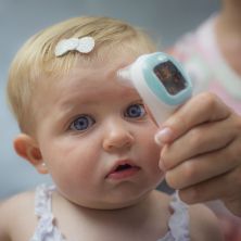 Mide la temperatura por infrarrojos, en tan solo 2 segundos en contacto con la frente o el oído del bebé.